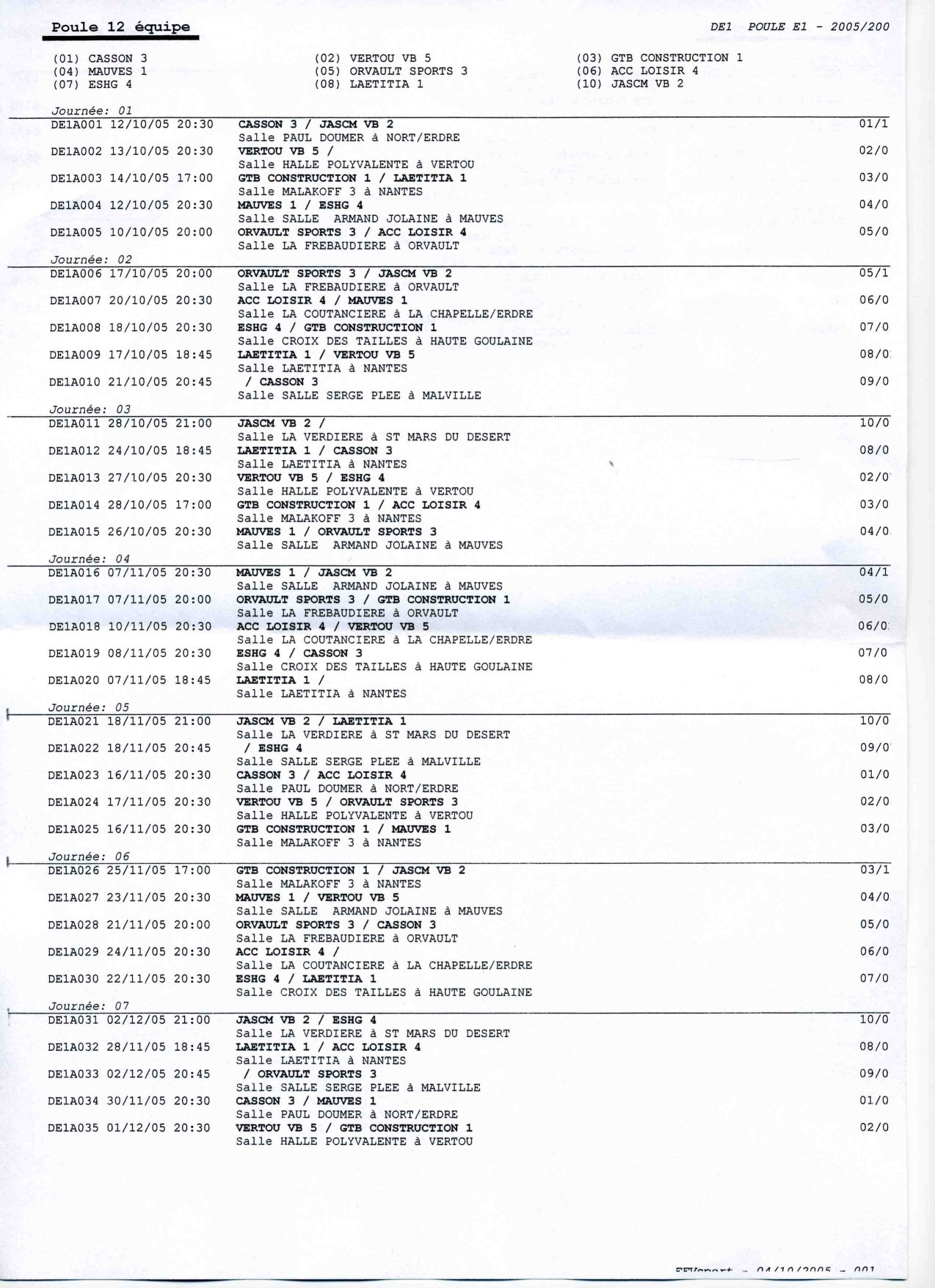 06/10/2005 - Equipe 1 : Planning 1ère partie de la saison