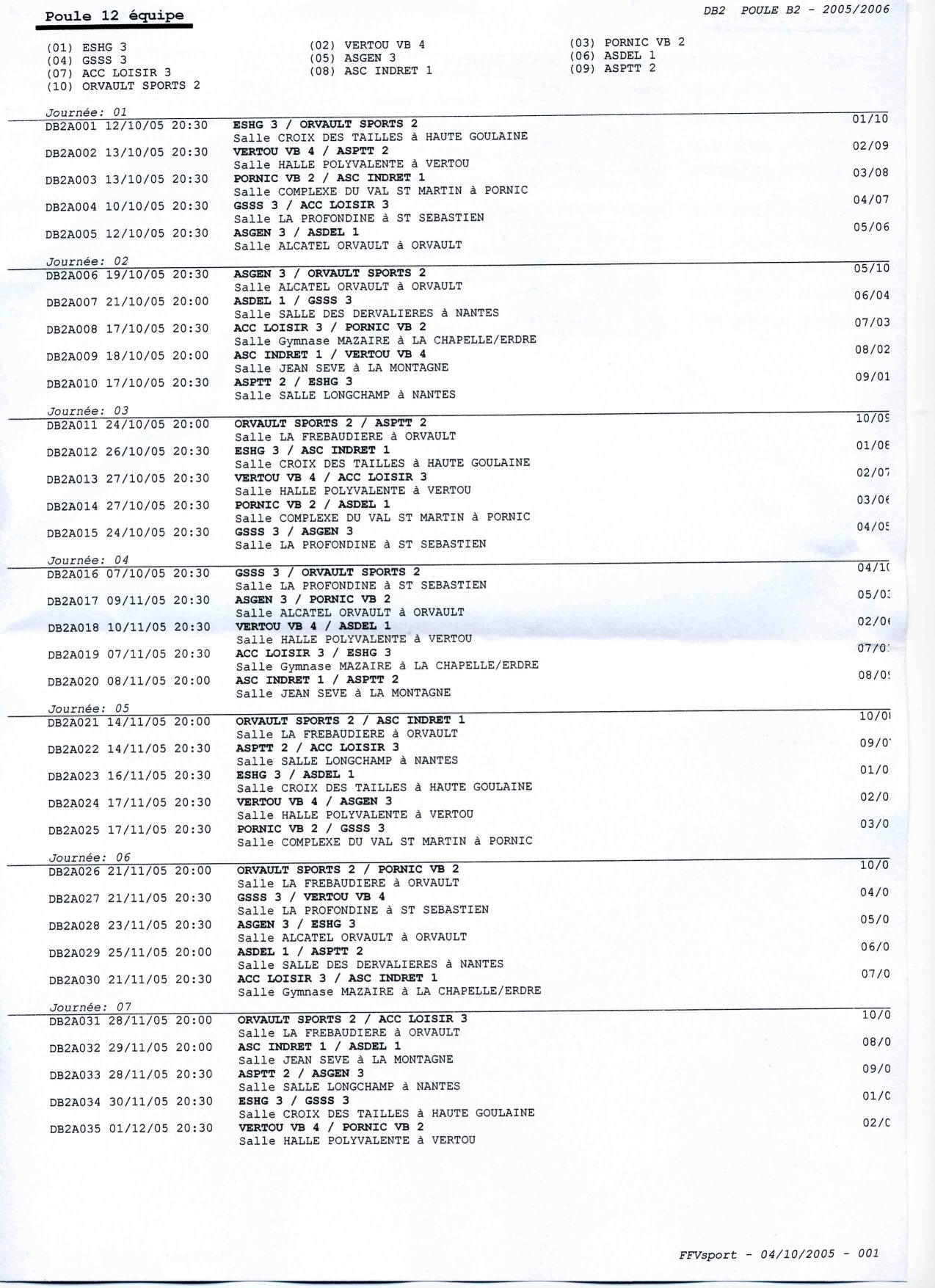 06/10/2005 - Equipe 2 : Planning 1ère partie de la saison
